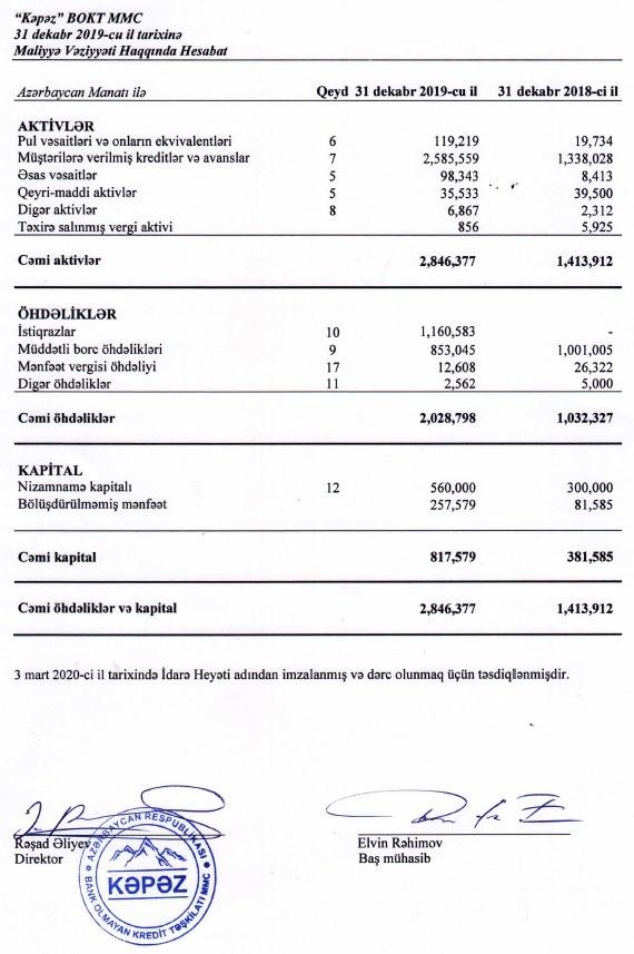 За отчетный период объем кредитного портфеля, выданного клиентам, увеличился на 7,7% или 198 472 AZN и достиг отметки 2 784 031 AZN. Общие активы организации увеличились на 257 861 AZN (9,1% в процентном выражении) до 3 104 198 AZN. Обязательства НКО увеличились на 3,9% или 78,824 AZN и составили 2107,622 AZN.