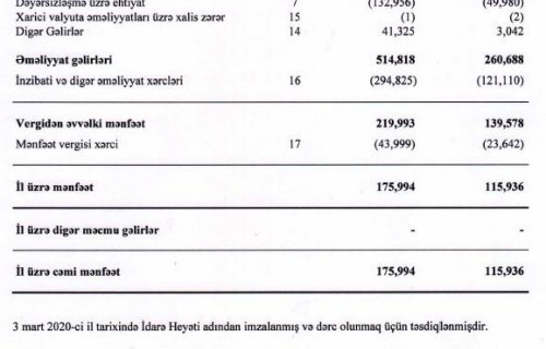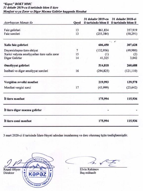 В соответствии с информацией, представленной в аудиторском отчёте организации за 2020 год, в указанном году процентный доход НКО «Кяпяз» вырос на 4,8% или 41 098 AZN (по сравнению с предыдущим 2019 годом), и составил 902 932 AZN, а операционные доходы возросли до 511 953 AZN. В результате организация завершила 2020 год с чистой прибылью в размере 178 997 AZN, что на 3 003 AZN или 1,7% больше показателя 2019 года.