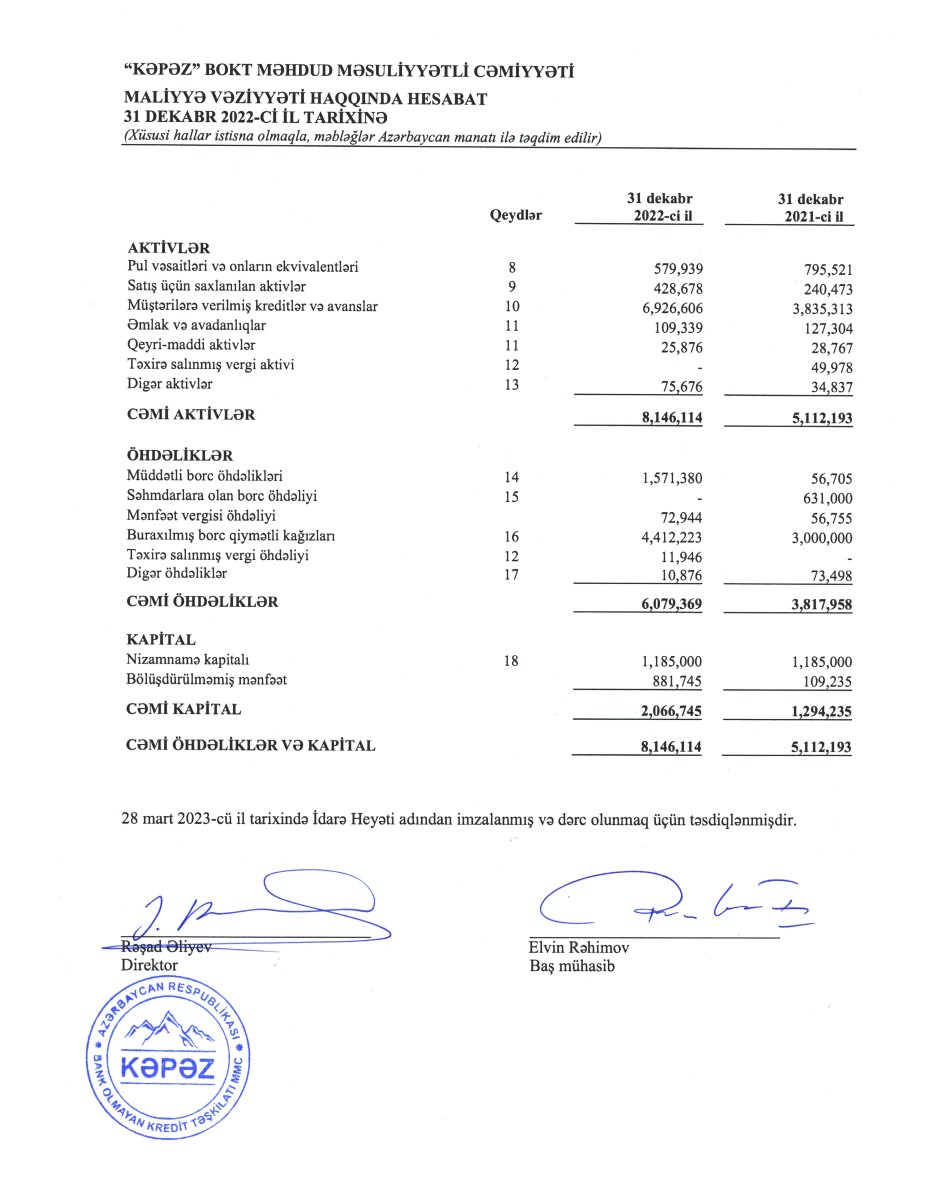 "Kəpəz BOKT"un kredit portfeli (müştərilərə verilmiş kreditlər) 2021-ci illə müqayisədə 2022-ci ildə 1,8 dəfə (80,6%) artaraq 6 milyon 927 min min manata çatıb. Ötən il kredit təşkilatının cəmi aktivləri isə 3 milyon 33 min manat və ya 59,3% artaraq 8 milyon 146 min manata yüksəlib.
