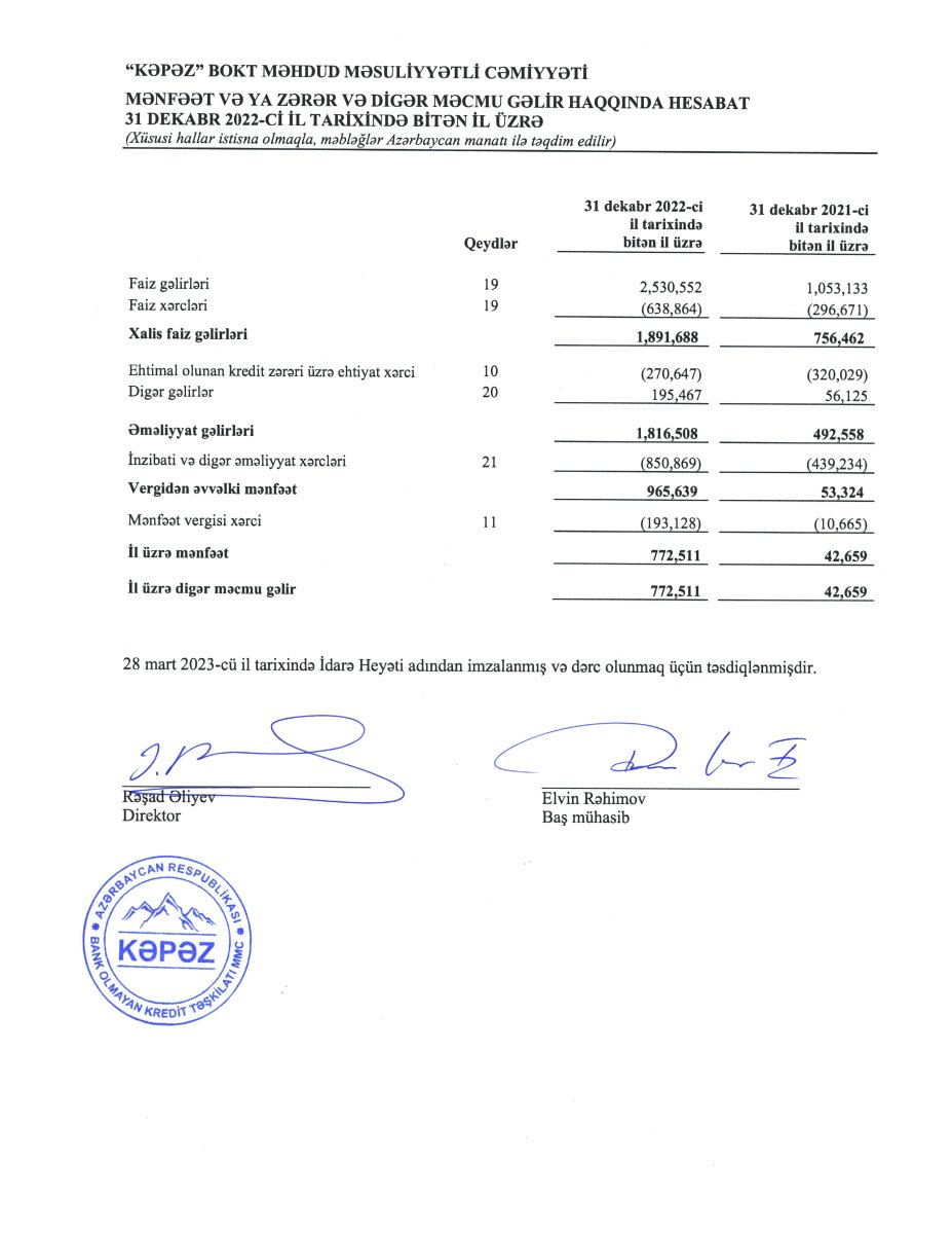 "Kəpəz BOKT" MMC 2022-ci ili 772 min 511 manat xalis mənfəət ilə başa vurub. Bank olmayan kredit təşkilatı 2021-ci ili 42 min 659 manat xalis mənfəət ilə bağlamışdı. Beləliklə, 2021-ci illə müqayisədə 2022-ci ildə "Kəpəz BOKT"un xalis mənfəəti 18 dəfədən çox artıb. Xalis mənfəətin artması əsasən gəlirlərin artmasından qaynaqlanır.